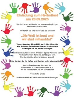 Einladung zum Herbstfest am 20.09.2025 von 13:00 - 18:00 Uhr auf dem Gelände der Kita am Schlösschen in Püttlingen