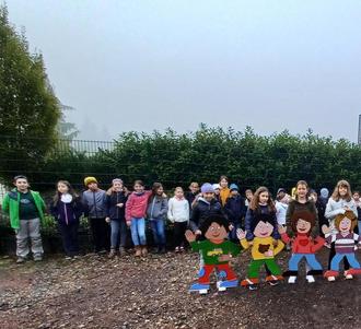 Kinder der Grundschule Köllerbach stellen bunte „Schulkinder-Figuren“ auf