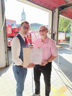 Minister Reinhold Jost übergab Beigeordnetem Gosbert Hubertus den Bewilligungsbescheid.
