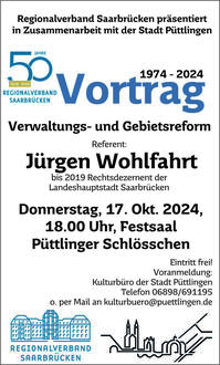 Gemeinsam mit dem Regionalverband Saarbrücken lädt die Stadt Püttlingen am Donnerstag, den 17. Oktober 2024, zu einem kostenfreien Vortrag über die Gebiets- und Verwaltungsreform von 1974 ein. Beginn der Veranstaltung im Festsaal des Püttlinger Schlösschens ist um 18.00 Uhr.