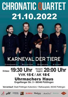 Am 21. Oktober 2022 findet im Uhrmachers Haus ein Aufeinandertreffen verschiedenster Musikgenres und eine Reise durch die Epochen der Musikgeschichte statt. Mozart, Robbie Williams, Vivaldi und Freddie Mercury scheinen nur auf den ersten Blick nicht zusammen auf eine Bühne zu passen, denn die Band Chronatic Quartet vereint die oftmals getrennt stattfindenden Musikstile und internalisiert wichtige Pfeiler der Musik wie Freiheit, Verspieltheit und Leidenschaft. Die vierköpfige Band ist seit zehn Jahren auf diversen Veranstaltungen und Konzerten unterwegs und konnte 2016 den Kulturpreis der Stadt Saarlouis gewinnen. Sie bietet spannende Geschichten, Comedy-Einlagen, virtuose musikalische Darbietungen und vereint damit Jung und Alt, Opernsänger und Rocker, Vergangenheit mit Gegenwart und Zukunft.