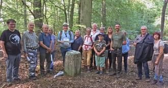 Die Wanderer verweilen vor dem Grenzstein Nr. 35 am Völklinger Gewann „Rattenschwanz“.