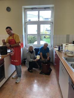 Das Sauerkraut muss nun eine zeitlang gären, wird dabei mehrmals von Rainer Feld und Stephan Lehberger umgerührt und wird nach dem Gärungsprozess an die Kursteilnehmerinnen und -teilnehmer ausgegeben.