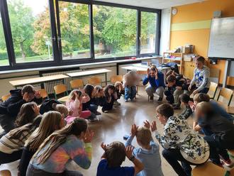 Die Schülerinnen und Schüler der 3. und 4. Klassen waren begeistert bei der Sache. Mit den Spielen Jeu du dé, Salade de fruits und einem Tiernamen-Spiel hatten die Kinder viel Spaß und lernten ganz nebenbei neue Wörter und Redewendungen. Beim Jeu du dé mussten sie je nach gewürfelter Zahl Fragen zu ihrem Namen, ihrem Alter, ihrem Wohnort oder ihren Vorlieben beantworten. Erst zum Abschluss gab Blaise Tesson den verblüfften Kindern zu erkennen, dass er auch Deutsch spricht. Er lobte das gute Sprachverständnis der Kinder und ermunterte sie weiter mutig und angstfrei die französische Sprache zu sprechen. Es wurde an diesem Morgen viel gelacht, ein schöner Beweis dafür, dass Lernen mit Bewegung und Freude am besten gelingt.