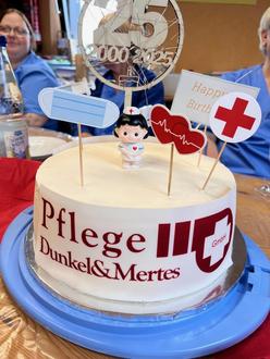 Was sich die beiden Firmen-Gründerinnen für die Zukunft noch vor fünf Jahren gewünscht haben, ist längst zur Realität geworden. Sie erzählen: „Die nächste Generation hat zwischenzeitlich den Betrieb übernommen. Genauso wie wir lieben sie diese Arbeit, achten auf ein gutes und wertschätzendes Miteinander, werden sicherlich den Pflegedienst weiterentwickeln und ihn gut für die Zukunft aufstellen.“ Beiden Töchtern – Annabelle Springer und Nicole Mertes – wurde der Beruf rund um die Pflege sozusagen in die Wiege gelegt. Mit Leidenschaft führen sie den Betrieb weiter und sind unendlich dankbar für die Vorarbeit durch beide Mütter, aber auch dankbar für das, was ihr Team tagtäglich leistet. Gemeinsam wurde daher mit dem Team in einer Teamsitzung mit Torte und Pizza ein viertel Jahrhundert Pflegedienst Dunkel & Mertes gefeiert.