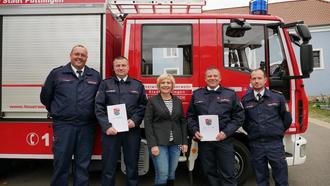 Im Anschluss an die Wahl überreichte Bürgermeisterin Denise Klein der einstimmig gewählten Löschbezirksführung ihre Ernennungsurkunden für weitere 6 Jahre. Auch Wehrführer Thomas Prinz sowie sein Stellvertreter Ruwen Dumont ließen es sich nicht nehmen, den beiden zu ihrem überragenden Wahlergebnis zu gratulieren. Die neu gewählte Löschbezirksführung bedankte sich bei den Feuerwehrangehörigen für das entgegengebrachte Vertrauen.