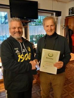 Der FV 08 Püttlingen hat auf der Mitgliederversammlung Jo Leinen für 40 Jahre treue Mitgliedschaft mit der Goldenen Ehrennadel ausgezeichnet. Jens Schmidt überreichte die Urkunde und die Ehrennadel, er bedankte sich für die Vereinstreue bei Jo Leinen. Dieser gab einen kurzen Rückblick über 40 Jahre im FV 08 Püttlingen, wo er heute noch mit den AH-Spielern kickt. Der Verein konnte sich in all den Jahren immer auf die Unterstützung von Jo Leinen verlassen, wenn er Fragen zu Genehmigungen oder Zuschüssen hatte. Darauf kann sich der Verein auch künftig verlassen.