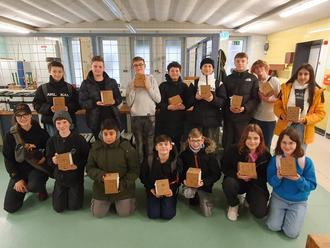 Jungs und Mädchen der Stufe 7 mit ihren selbst gebauten Insektenhotels