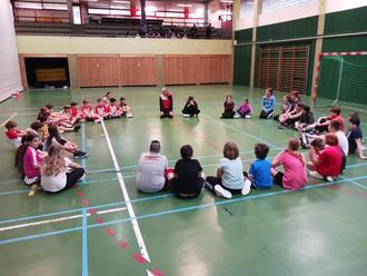 Auf Einladung der Gemeinschaftsschule Peter Wust kamen am 24.1.2025 die beiden 4. Klassen der GS Pater Eberschweiler sowie die Klassen 5.1 und 5.3 der GEM zu einem Sportspaßtag im Trimmtreff zusammen. Begleitet von den Lehrern Fr. Martin, Fr. Raubuch, Fr. Klepper und Hr. Petermann, durften sich die Kinder im Miteinander an den verschiedenen Stationen sportlich betätigen. Nachdem sich die gemischten Teams einen kreativen Gruppennamen ausdachten, ging es auch schon - mit Laufzetteln bewaffnet - voller Vorfreude zu den sechs aufgebauten Stationen. Die einen entdeckten ihr Talent beim Hockeyparcours, andere fanden Spaß am Gummistiefelweitwurf oder Flipflopzielwerfen. Wieder andere gaben alles beim Pedalorennen, Sackhüpfen oder Standweitdreisprung. Harmonisch, mit Freude und Ehrgeiz, verlief der gesamte Sportvormittag. Nach einem gemeinsamen Abschlussspiel wurden die Gewinner des Tages benannt. Die Sportlehrer Fr. Hallerberg und Hr. Colling waren mit der Durchführung der Veranstaltung mehr als zufrieden und dankten am Ende den motivierten Schülern sowie den fleißigen Helfern aus den Klassen 9 der Peter Wust. Nach dem hohen Leistungsdruck der letzten Wochen vor den Halbjahreszeugnissen war dies für alle eine schöne Belohnung, die im kommenden Jahr mit den zukünftigen 4ern und 5ern sicherlich nach Wiederholung schreit.