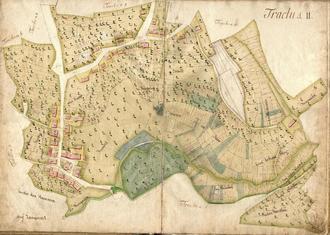 Auch die Karten zu den Bannbüchern werden im Archiv der Stadt Püttlingen verwahrt. Hier zu sehen die Karte zum Tractus II. Diese zeigt u. a. den Flur „In den Mühlwiesen“, das heutige Wohngebiet „Am Schlehbach“.