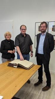 (v.l.n.r.) Bürgermeisterin Denise Klein mit Archivar Stefan Handfest und Herrn Dr. David Schnur vom Saarländischen Landesarchiv.