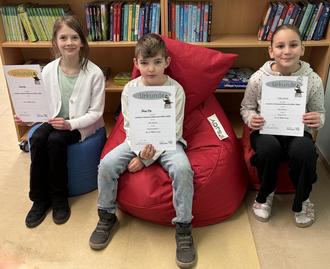 Im Anschluss fand der Vorlesewettbewerb „Lesedino“ für die vierten Klassen statt. Qualifiziert hatten sich aus der Klasse 4a Ceylin Bozdag und Leony Grün sowie Nele Hübschen und David Wollscheidt aus der Klasse 4b. Aus der Klasse 4c nahmen Rosa Balzert und Louise Kunz teil. Auch sie trugen sowohl einen geübten als auch einen ungeübten Text vor. Auch in diesem Wettbewerb musste die fachkundige Jury abwägen und es wurde eine sehr knappe Entscheidung. Bewertet wurden unter anderem Lesefluss, Betonung und Aussprache. Die gesamte Zuhörerschaft war von den überragenden Vorleseleistungen beeindruckt. Am Ende konnte sich Louise Kunz (4c) gegen die starke Konkurrenz durchsetzen. Mit ihrem ausdrucksstarken Vortrag, ihrer klaren Stimme und ihrem sicheren Auftreten überzeugte sie die Jury und gewann den ersten Platz.