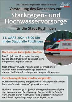 Daher lädt die Stadt Püttlingen die interessierte Bevölkerung zur Vorstellung des Hochwasser- und Starkregenvorsorgekonzeptes mit Präsentation der Maßnahmenentwürfe ganz herzlich ein.
