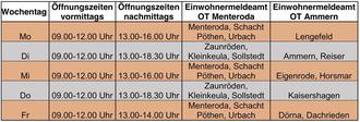 Für die Einwohner der Ortsteile Kleinkeula, Menteroda, Sollstedt, Schacht Pöthen, Urbach und Zaunröden haben wir die Außenstelle Menteroda als Anlaufpunkt vorgesehen. Die Einwohner der Ortsteile Ammern, Dachrieden, Dörna, Eigenrode, Horsmar, Lengefeld, Kaisershagen und Reiser haben die Möglichkeit im Ortsteil Ammern vorstellig werden.