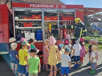 Im Rahmen dessen wurde den Kindern und Erziehern die Möglichkeit geboten, sich die Freiwillige Feuerwehr Horsmar anzuschauen. Mit großen Augen schauten sich die Kinder die Einsatzfahrzeuge und die Ausstattung der Feuerwehr an und hörten den Feuerwehrmännern Mario Göbel und Dominik Siebert gespannt zu, wie ein Feuerwehreinsatz abläuft. Doch nicht nur der Ablauf eines Feuerwehreinsatz wurde dem Kindern erklärt, sondern es wurde auch geschaut welche Gerätschaften in einem Feuerwehrfahrzeug zu finden sind und welche Maßnahmen die Kinder treffen können damit kein Feuer entsteht und die Kinder sich nicht verbrennen. Anschließend durften alle Kinder sich einmal selbst in ein Einsatzfahrzeug setzen.
