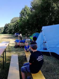 Zurück in Horsmar schlugen 9 Feuerwehrkinder am Sportplatz ihr Zeltlager auf, machten ein Lagerfeuer und übernachteten dort. Ein gemeinsames Frühstück, das Axel Meyer und Katja Fritz brachten, war ein gelungener Abschluss.