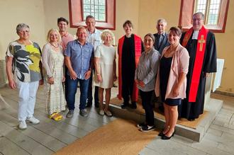 Gemeindekirchenräte und Superintendent Christian Beuchel nehmen Pfarrerin Juliane Themel in ihre Mitte.