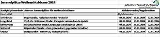 Im Januar 2024 werden in den Städten und Gemeinden Sammelplätze für die gebührenfreie Weihnachtsbaumentsorgung von privaten Haushalten zur Verfügung gestellt. Die Lage der Sammelplätze und die jeweiligen Abfuhr- bzw. Abgabetermine sind der nachfolgenden Übersicht zu entnehmen, welche ebenfalls auf der Homepage des Abfallwirtschaftsbetriebes www.abfallwirtschaft-uhk.de veröffentlicht wird. Nutzer eines Bioabfallbehälters können den Weihnachtsbaum im Januar am jeweiligen Leerungstermin auch neben ihrem Bioabfallbehälter bereitlegen. Es werden nur vollständig abgeschmückte, auf 1,50 m gekürzte Weihnachtsbäume ohne Verpackung mitgenommen.