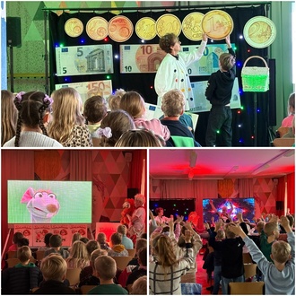 Am 21. Oktober 2025 besuchte Clown Hajo und Ada den Primarstufenteil unserer Schule in Menteroda mit seinem Mitmachprogramm „Klimberklein“. Im Auftrag des Vereins „Bildung und Erziehung mit Kunst und Kultur für Vorschulkinder und Grundschüler“ und der Sparkasse Unstrut-Hainich-Kreis erklärte die Sparmaus alles Wichtige rund um das Thema Geld.