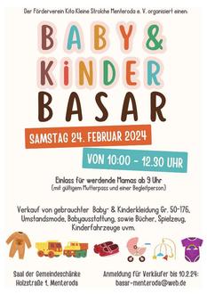Alles rund ums Kind gibt es am 24.02. von 10:00 - 12:30 Uhr auf dem Saal der Gemeindeschänke in Menteroda. Verkauft wird gebrauchte, aber noch gut erhaltene Kleidung, Bücher, Spielzeug, Babyausstattung, Umstandsmode uvm.