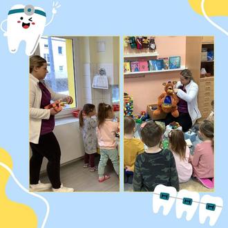 Nach dem Frühstück wurde den Kindern spielerisch durch eine Zahnarzthelferin erklärt, welche Lebensmittel gesund und welche ungesund sind. Damit wir unsere Zähne lange haben, müssen wir wissen, wie wir sie richtig putzen. Dies zeigte sie nicht nur an ihrem Känguru Hektor, sondern übte es sofort mit den Kindern im Bad. Besonders ein Zahnputzlied unterstütze sie tatkräftig. Bereits die Kleinsten, „unsere Bienchen“ durften sich an einem vergrößerten Mund mit dem Zähneputzen ausprobieren.