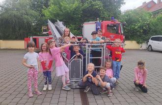 Am Montag durfte wir die ansässige Feuerwache Artern besuchen. Herr Hauthal begrüßte uns und begleitete uns zunächst in die Halle, in der die verschiedenen Fahrzeuge standen. Dort mussten unsere Kinder erstmal ihr Wissen unter Beweis stellen, z.B. „Wie lautet die Nummer der Feuerwehr und der Polizei?“. Natürlich wussten unsere Kinder Bescheid! Dann durften die Umkleidekabinen mit der kompletten Ausrüstung besichtigt werden. Anschließend versammelten wir uns auf den Hof.
