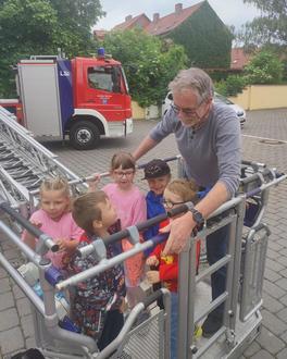 Herr Hauthal hatte da doch tatsächlich noch eine Überraschung für uns und fuhr eins der Fahrzeuge nach draußen. Das durfte dann nochmal genauestens untersucht und inspiziert werden. Als dann auch noch die Drehleiter einmal komplett ausgefahren wurde, staunten wir nicht schlecht.