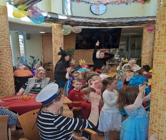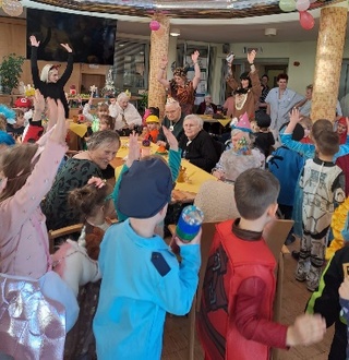Etwas später zogen auch die größeren Kinder los, um die Bewohner zu überraschen, denn auch dort wurde gefeiert. Gemeinsam wurden ein paar Faschingslieder geträllert. Rucki Zucki war der Besuch vorbei, die Kinder machten sich wieder auf den Heimweg.