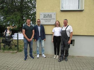 Bürgermeister Wolfgang von Eye, AWG-Vorstand Jürgen Igel sowie Steinmetz Marko Gödocke mit Tochter vor der sanierten Gedenktafel für Thomas Müntzer.