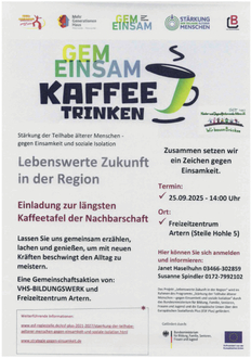 | 14.00 Uhr | Längste Kaffeetafel der Nachbarschaft - Einladung zum Kaffeetrinken im Freizeitzentrum Artern, in Zusammenarbeit mit dem VHS - Bildungswerk und dem Projekt Agathe |