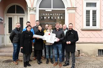 Teilnehmer bei der Schlüsselübergabe des Büros Citymanagement.