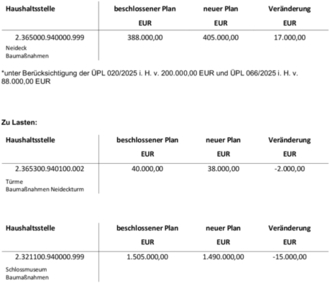 Der Finanzausschuss beschließt über eine überplanmäßige Ausgabe in Höhe von 17.000 EUR in der Haushaltsstelle 2.365000.940000.999 - Neideck - Baumaßnahmen.