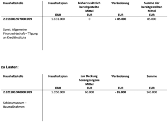 Genehmigung einer überplanmäßigen Ausgabe in der Haushaltsstelle 2.911000.977000.999 in Höhe von 85.000 EUR zu Lasten der Haushaltsstelle 2.321100.940000.999