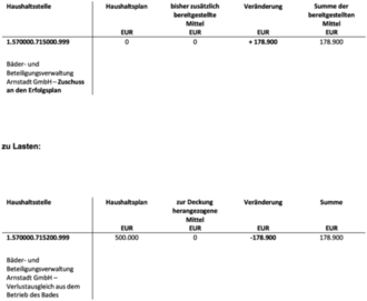 Der Finanzausschuss beschließt eine überplanmäßige Ausgabe in Höhe von 178.900 EUR in der Haushaltsstelle 1.570000.715000.999 - Bäder- und Beteiligungsverwaltung Arnstadt GmbH - Zuschuss am dem Erfolgsplan.