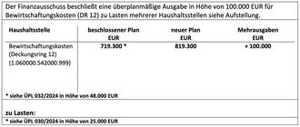 Genehmigung einer überplanmäßigen Ausgabe in Höhe von 100.000 EUR für Bewirtschaftungskosten (Deckungsring 12) zu Lasten der Haushaltsstellen: