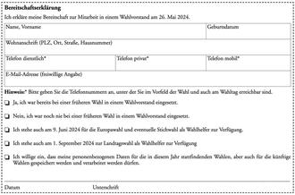 Haben Sie Interesse? Füllen Sie einfach die abgedruckte Bereitschaftserklärung aus und senden sie per E-Mail an wahlbuero@stadtverwaltung.arnstadt.de oder per Post an Stadtverwaltung Arnstadt, Wahlbüro, Markt 1, 99310 Arnstadt.