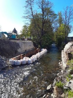 Beim Beginn der Rammarbeiten für die Spundwände traten unerwartete Hindernisse auf. Ein Betonfuß des massiven Brückenwiderlagers auf der Unterwasserseite (Thales) musste zunächst abgebrochen werden, um Platz für die weiteren Wände zu schaffen. Die Arbeiten am Spundwandverbau auf der Thales-Seite sollen voraussichtlich diese Woche abgeschlossen werden, um in der kommenden Woche mit dem Abbruch des Widerlagers zu beginnen. Gleichzeitig startet auf der gegenüberliegenden Seite, beim Eisenwerk, der Einbau weiterer Spundwände.