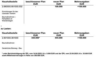 Der Finanzausschuss beschließt eine überplanmäßige Ausgabe in Höhe von 100.000 EUR in der Haushaltsstelle 2.680000.951000.002 - Einrichtungen für den ruhenden Verkehr - Baumaßnahmen - Parkplätze an Wanderwegen.