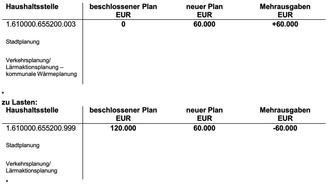 Der Finanzausschuss beschließt eine überplanmäßige Ausgabe in Höhe von 60.000 EUR in der Haushaltsstelle 1.610000.655200.003 - Stadtplanung - Verkehrsplanung/ Lärmaktionsplanung - kommunale Wärmeplanung.