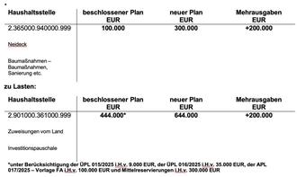 Der Finanzausschuss beschließt eine überplanmäßige Ausgabe in Höhe von 200.000 EUR in der Haushaltsstelle 2.365000.940000.999 - Neideck - Baumaßnahmen - Baumaßnahmen, Sanierung etc.