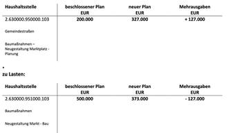 Der Finanzausschuss beschließt eine überplanmäßige Ausgabe in Höhe von 127.000 EUR in der Haushaltsstelle 2.630000.950000.103 - Gemeindestraßen - Baumaßnahme Neugestaltung Marktplatz - Planung.