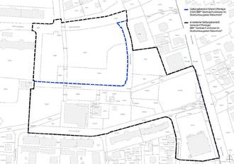 Die im Lageplan schwarz-gestrichelte Linie stellt den Geltungsbereich inklusive der nördlichen Erweiterungsfläche dar (Stand 2025), während die blau-gestrichelte Linie dem damaligen Stand des Geltungsbereichs zur ersten Veröffentlichung im Internet entspricht (Stand 2022).