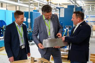 Wirtschaftsförderer Jörg Neumann, Bürgermeister Frank Spilling und Wintersteiger Sägen-Geschäftsführer Stefan Hengelhaupt beim Rundgang durch die Produktion.
