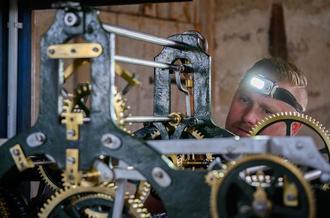 Die Arbeit an der komplexen Mechanik der über 100 Jahre alten Turmuhr benötigt höchste Konzentration - und viel Licht.