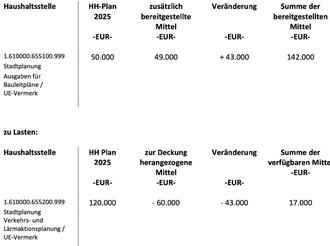 Der Finanzausschuss beschließt eine überplanmäßige Ausgabe in Höhe von 43.000 EUR in der Haushaltsstelle 1.610000.655100.999 - Stadtplanung - Ausgaben für Bauleitpläne / UE-Vermerk.