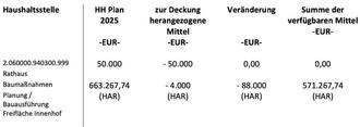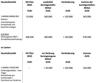 Der Finanzausschuss beschließt eine überplanmäßige Ausgabe in Höhe von 130.000 EUR in der Haushaltsstelle 1.060000.500000.999 - Rathaus - Unterhaltung der Grundstücke und baulichen Anlagen (Deckungskreis 0007).
