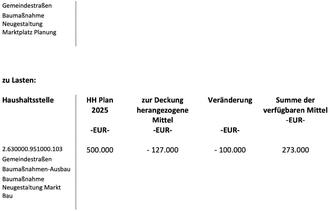 Der Finanzausschuss beschließt eine überplanmäßige Ausgabe in Höhe von 100.000 EUR in der Haushaltsstelle 2.630000.950000.103 - Gemeindestraßen - Baumaßnahme Neugestaltung Marktplatz Planung.