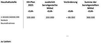 Der Finanzausschuss beschließt eine überplanmäßige Ausgabe in Höhe von 88.000 EUR in der Haushaltsstelle 2.365000.940000.999 - Neideck - Baumaßnahmen.