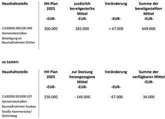 Der Finanzausschuss beschließt eine überplanmäßige Ausgabe in Höhe von 67.000 EUR in der Haushaltsstelle 2.630000.983100.999 - Gemeindestraßen - Beteiligung an Baumaßnahmen Dritter.