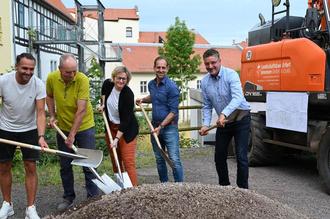 Beim Spatenstich v.l.n.r.: Andreas Staufenbiel, Bernhard Deimel, Daniela Zeiß, Denis Steger, Bürgermeister Frank Spilling